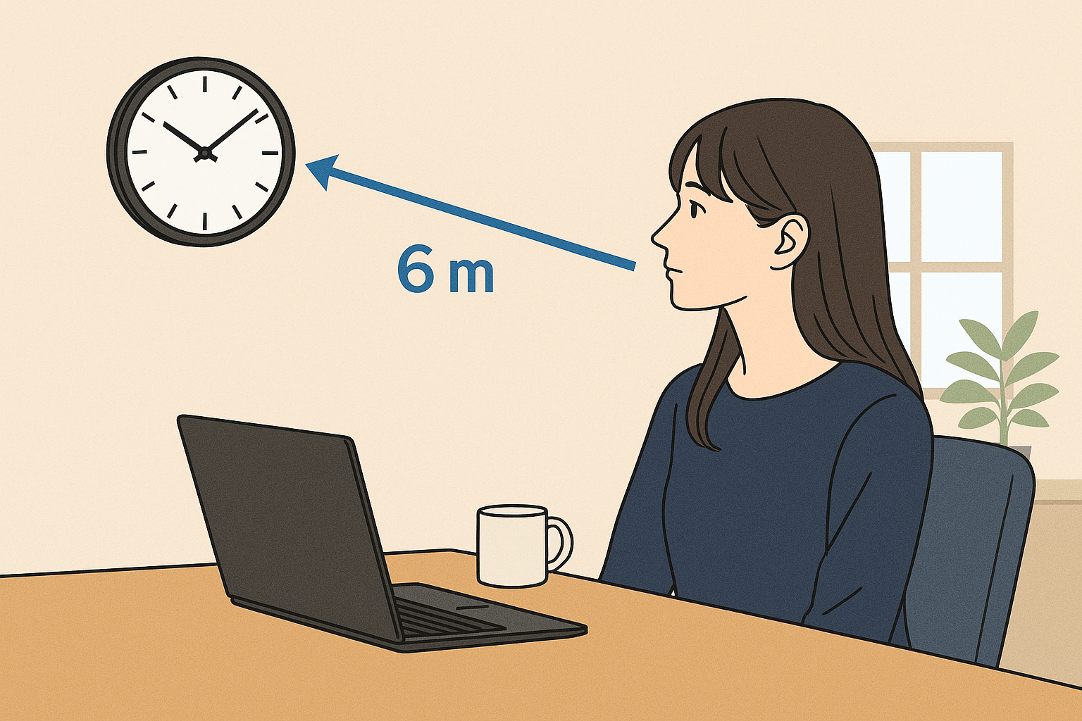 20分ごとに20秒間、約6メートル先を見ると毛様体筋の緊張が和らぎ、疲労軽減が期待できます( American Academy of Ophthalmology, 2020)。 実践例:窓の外の建物や、部屋の一番奥の時計・壁などを眺める。