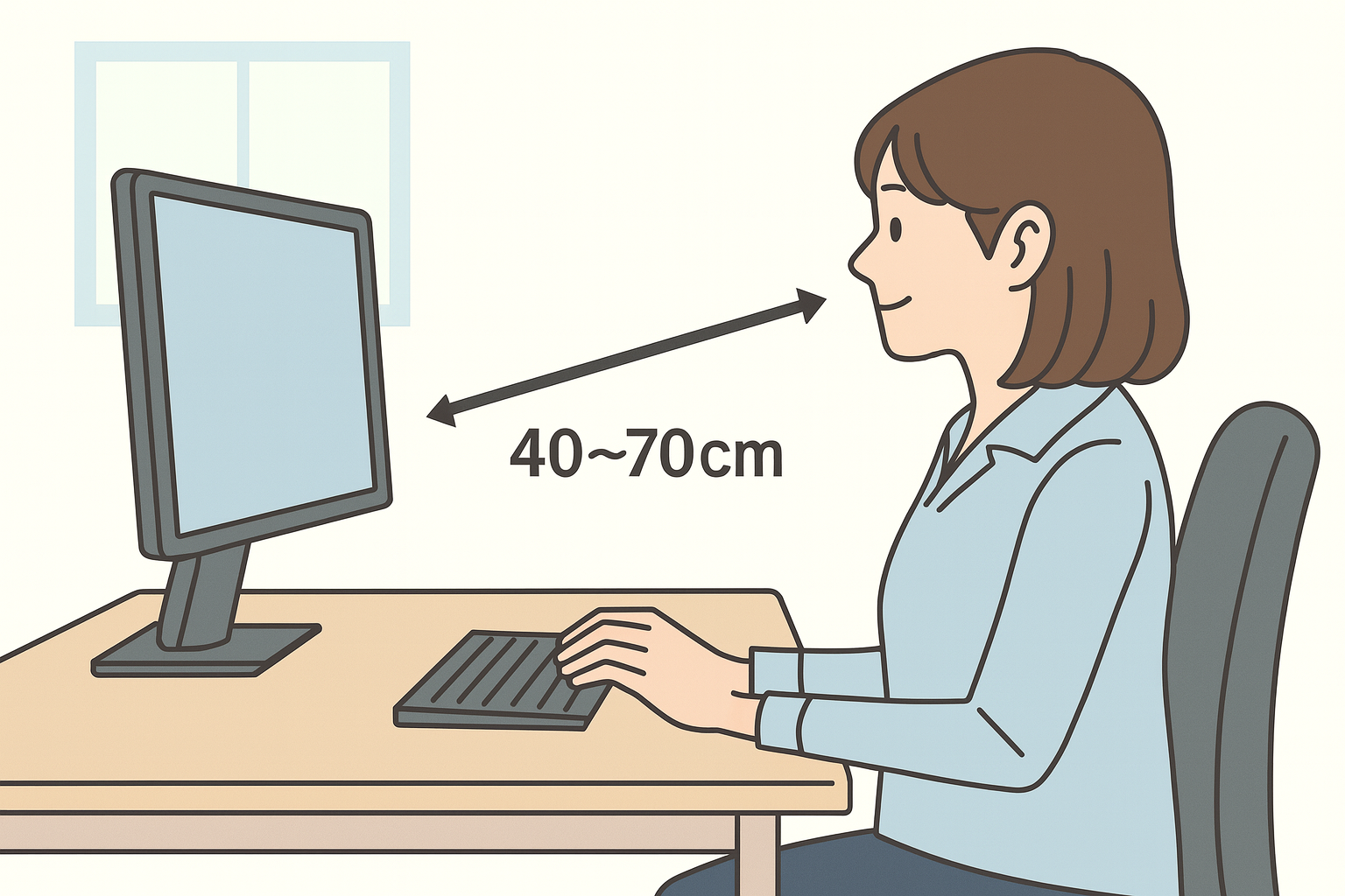 目の高さよりやや下、距離は40〜70cmを目安に(厚生労働省 e-ヘルスネット)、モニターの位置を調節するようにしましょう。